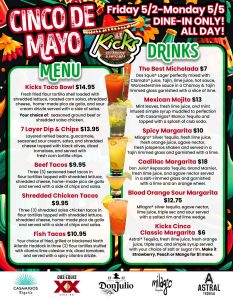Join us for 4 days of fun as we celebrate Cinco de Mayo at JF Kicks all weekend long, the Cinco de Mayo 4-Day Fiesta! We have a special Cinco de Mayo menu and special events planned. Take a look…