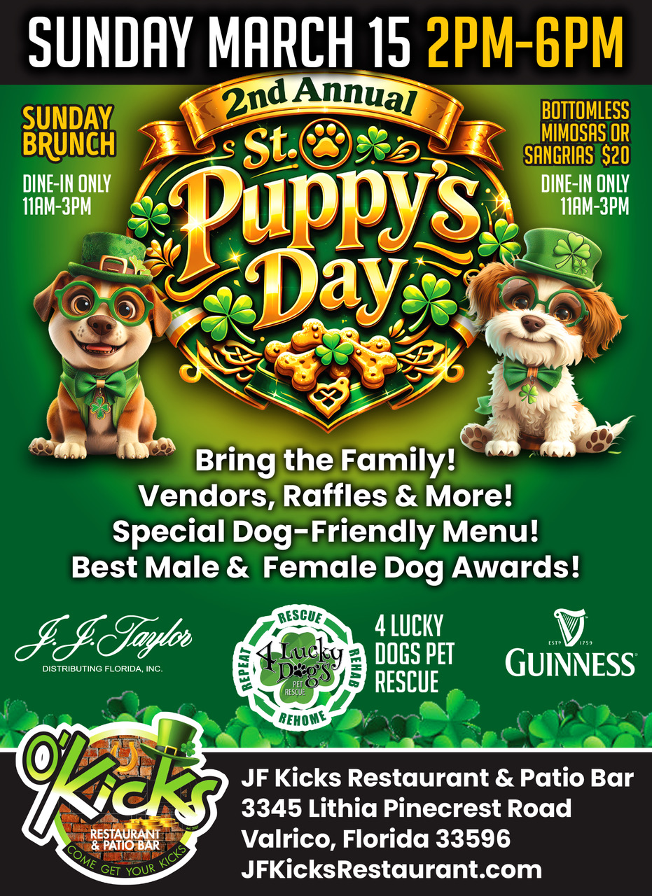 Get in the St. Patrick’s Day Spirit with the 2nd Annual St. Puppy’s Day at JF Kicks and in collaboration with 4 Lucky Dogs Pet Rescue. Bring your dogs and help us celebrate! This family-friendly event will have awards for Best Female Dog and Best Male Dog, vendors, raffles, and more! We’ll have Sunday Brunch 11am-3pm. And guess what? We have a very special menu just for dogs (which our furry friends are big fans of), so feel free to treat your best bud and hang out on our covered patio.