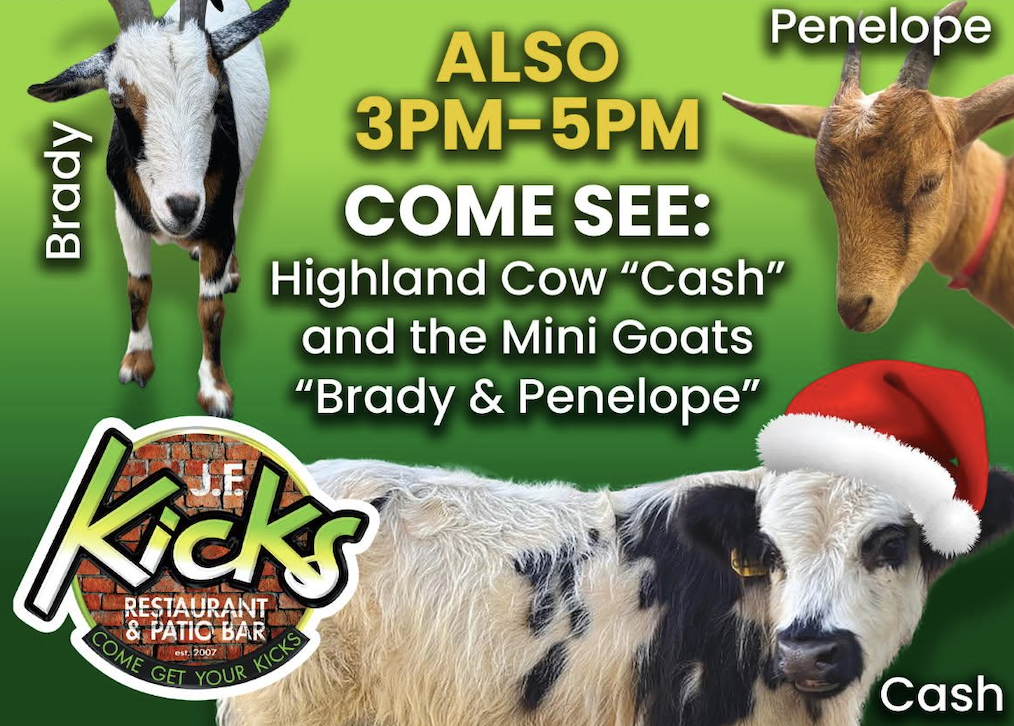 Meet Cash the Highland Cow and Mini Goats Brady and Penelope on Sunday, December 14 from 3-5pm.