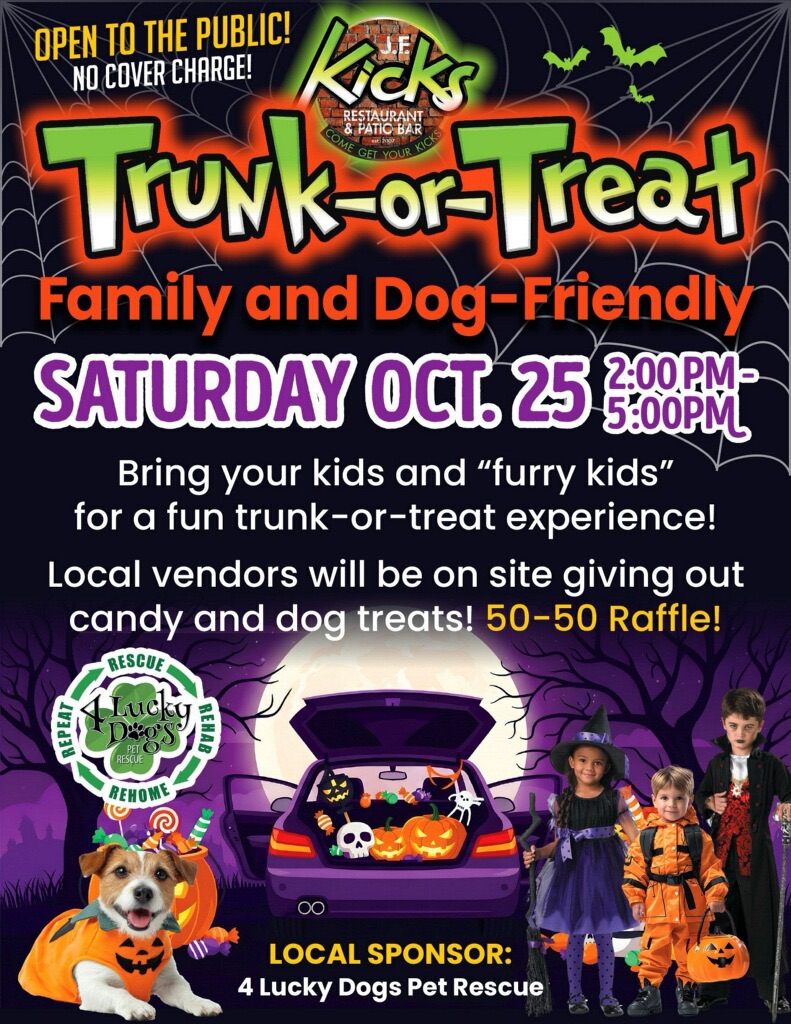 We're hosting a dog and family friendly Trunk or Treat that will be a spooky good time for all! It's open to the public and there's no cover charge. Local vendors will be here giving out candy and dog treats. Plus there will be a 50-50 Raffle! Sponsored by 4 Lucky Dogs Pet Rescue