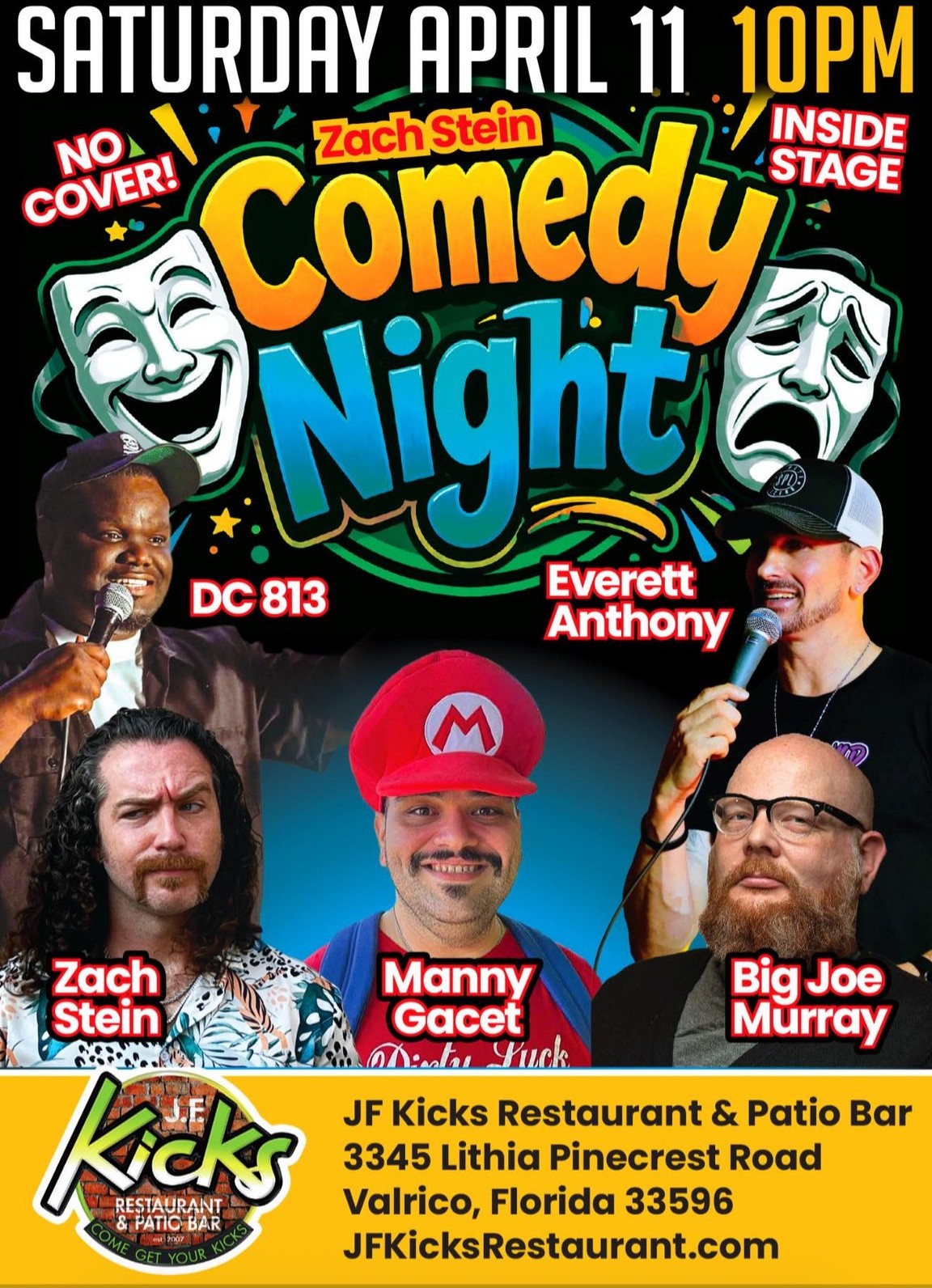 Big laughs at Comedy Night at JF Kicks, and no cover! Featuring: - Zach Stein- DC 813- Everett Anthony- Big Joe Murray- Manny Gacet