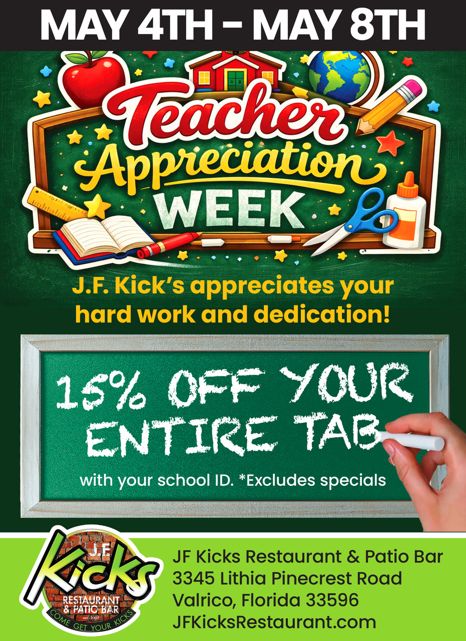 We appreciate everything that teachers do for their students, schools, and communities! As a token of our appreciation, we're offering 15% off your tab during Teacher Appreciation Week. *With your school ID. Excludes specials.