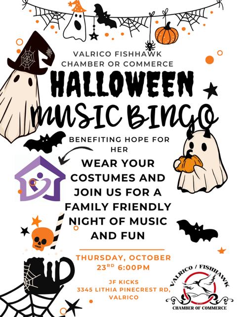 Ready for a spooktacular night out? Join the Valrico Fishhawk Chamber of Commerce for Halloween Music Bingo, an evening of hauntingly fun tunes, prizes, and plenty of laughs! Come play your heart out and support their 2025 Charity of Choice: Hope For Her. Bingo cards will sell for $20 each.