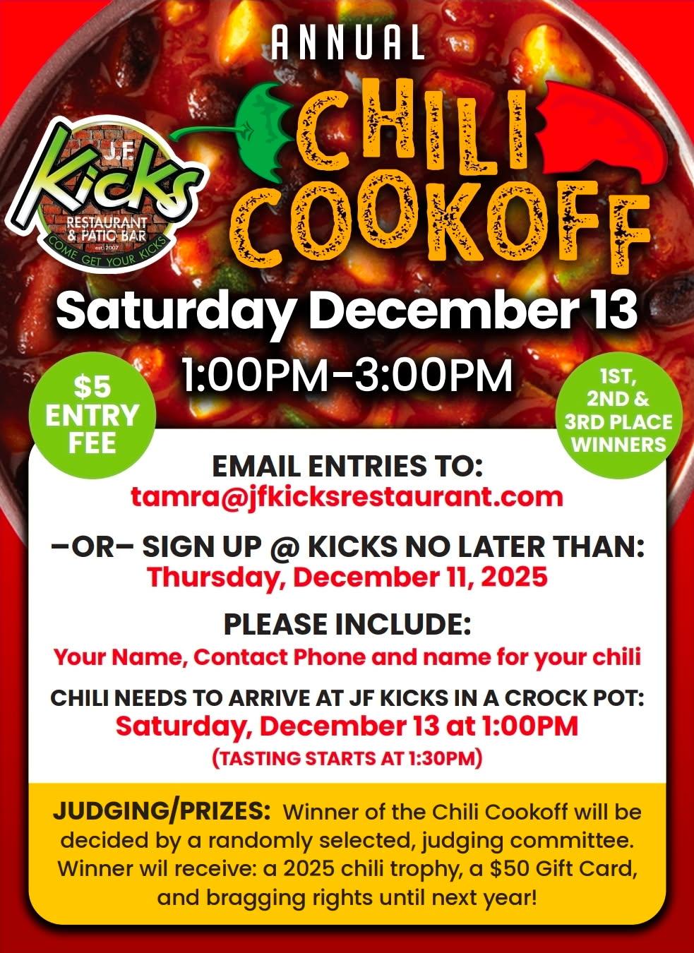 Join the Annual Chili Cookoff at JF Kicks on Saturday, December 13! To join the cookoff and compete to be the 2025 chili champion, please email tamra@jfkicksrestaurant.com or sign up […]