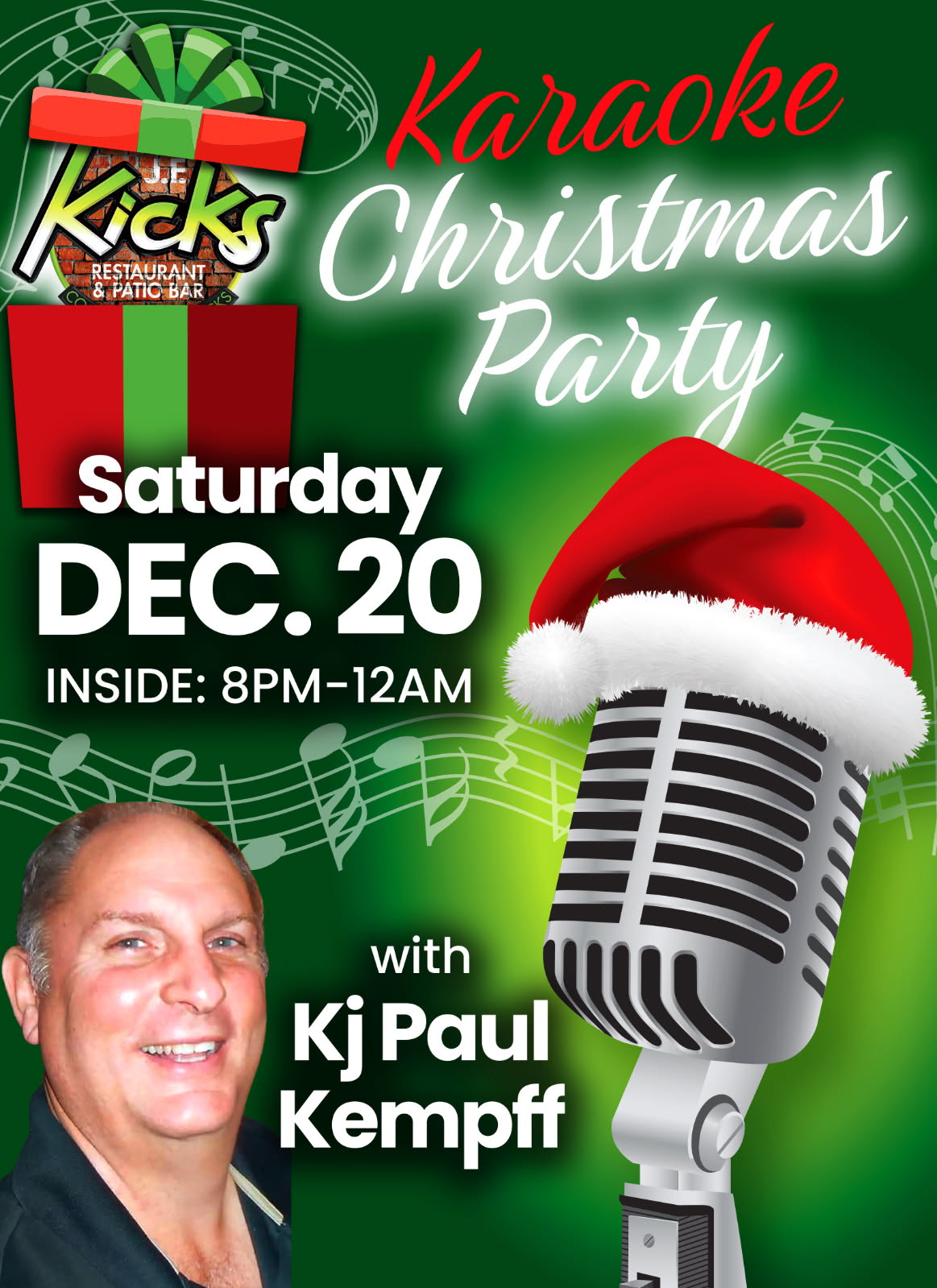 Come sing your heart out in a festive, holiday version of karaoke hosted by KJ Paul Kempff!