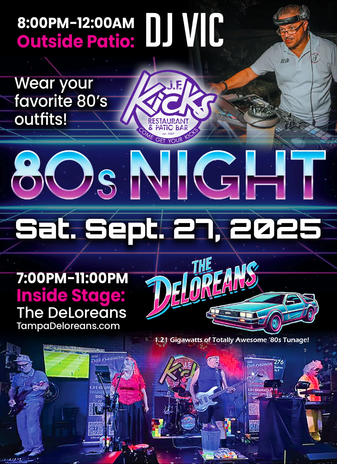 It's a totally radical 80's party at JF Kicks with The DeLoreans and DJ Vic! Wear all your best 80's getups and get ready to dance! A time traveling dance party you won't want to miss, with all your favorite 80's songs! The DeLoreans:Â 7-11pm (Inside Stage) DJ Vic: 8pm-12am (Patio Stage)